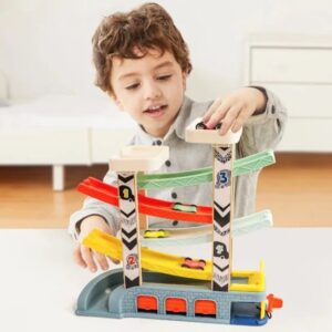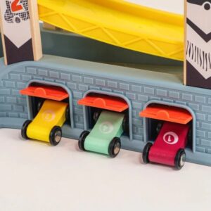 ¡Listos, preparados, ya! ¿Rosa o amarillo? ¿Cuál es el coche más rápido? La pista de carreras Topbright deleita a niños y niñas a partir de 18 meses con la diversión de carreras rápidas y seguras con cuatro robustos coches de madera.