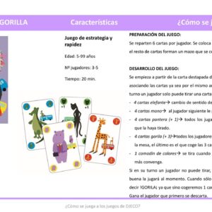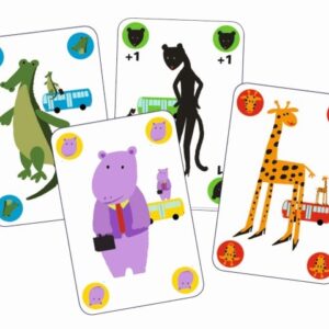 -Un juego de táctica, donde para ganar, hay que asociar los animales o los colores del autobús para quedarse sin cartas. Algunas cartas especiales obligan a los jugadores a sacar cartas adicionales, cambiar de dirección o saltarse su turno. Atención, ¡solo los jugadores más rápidos podrán evitar al gorila!