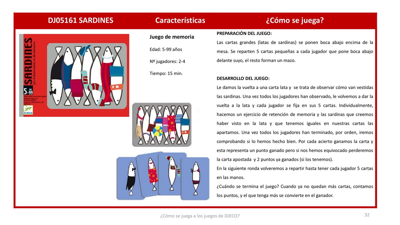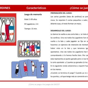 -Un juego de memoria en el que hay que encontrar tantas sardinas como sea posible entre aquellas escondidas en el fondo de la lata. En cada ronda del juego, los jugadores tienen unos segundos para observar y memorizar las sardinas en la lata y luego tratar de encontrarlas entre sus cartas. ——-Cuando el mazo se agota, el jugador que haya pescado más sardinas gana la partida.