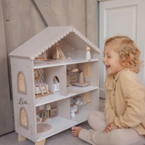 La casa de muñecas viene completa con todo lo esencial que tu hijo necesita para crear su propio mundo en miniatura. Incluye un armario, una cama, un sofá, una cocina, una mesa, sillas, una bañera, una aspiradora y mucho más. El set también incluye una encantadora familia de muñecas de madera, listas para entrar a vivir y darle vida a la casa de muñecas.
