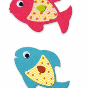 Contenido: Una multitud de pegatinas: 24 siluetas de «peces» de fieltro, 6 tableros de volumen de «aletas» y 2 tableros de ojos móviles.