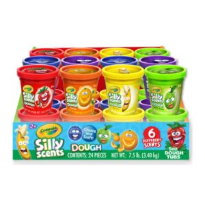 La Plastilina Silly Scents de Crayola incluye 6 diferentes colores, amarillo, verde, rojo, naranja, azul y morado y 6 olores, plátano, manzana, fresa, naranja, arándano y uva.