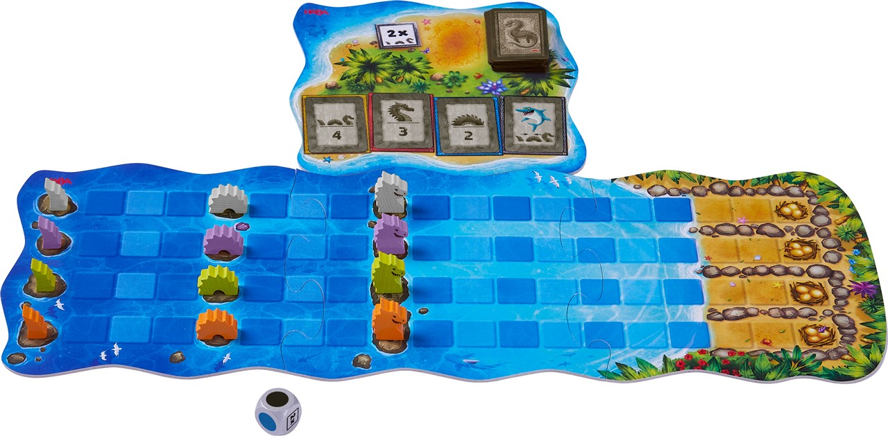 CONTENIDO: 4 dragones de agua (de tres piezas cada uno), 1 océano (tablero de tres piezas para montar), 1 isla (depósito para cartas), 36 cartas, 1 dado, 1 instrucciones del juego