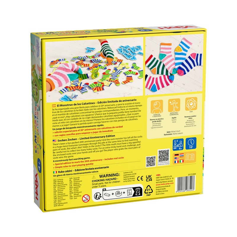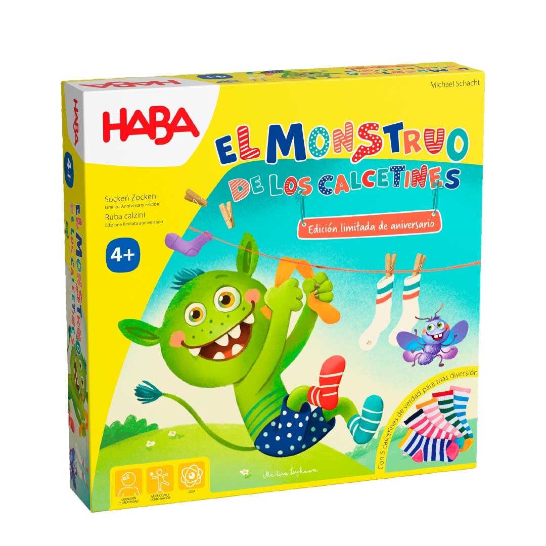 El Monstruo de los calcetines está de celebración. Lleva 20 años ya con nosotros y eso se merece celebrarlo por todo lo alto. Esta versión incluye calcetines de verdad para ponertelos en la mano, así como una polilla juguetona que enreda las cosas. Todos los jugadores jugan al mismo tiempo buscando parejas de calcetines.