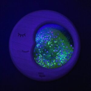Nuestra Sensory Moon es una invitación a ensoñar y acurrucarse entre sus dulces centelleos luminosos. Fabricada en madera de haya natural, en su interior se agitan pigmentos que capturan la atención de los más pequeños, ayudándoles a ejercitar el seguimiento ocular y a entrar en un estado de calma. Nuestra Sensory Moon brilla en la oscuridad: basta con cargarla antes en una fuente de luz natural o de luz negra.