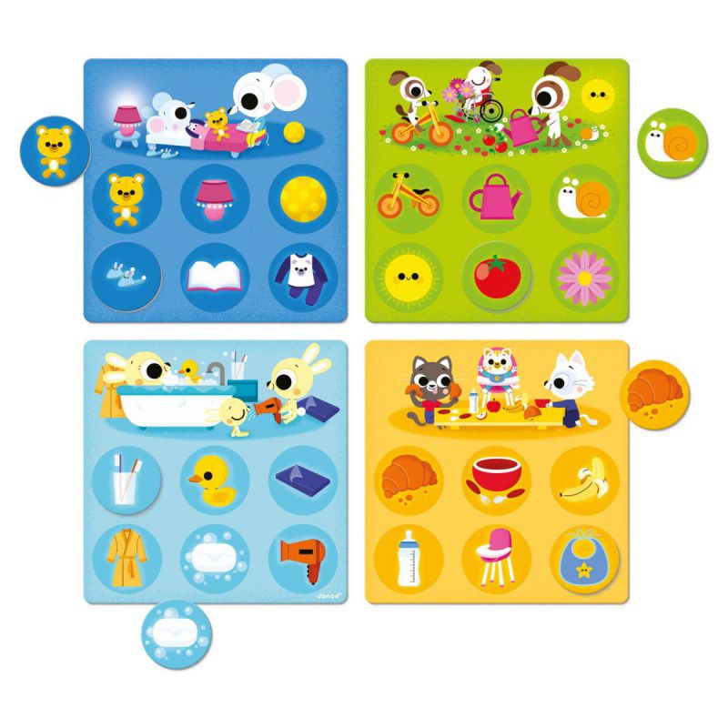 ¡Vamos a descubrir las diferentes estancias de la casa! Este bingo con la temática de la casa ayudará a su hijo con las asociaciones de imágenes. Compuesto por 4 tableros (cocina, habitación, baño y jardín) y 24 fichas, su hijo identificará 6 ilustraciones características de cada una de las estancias de la casa (biberón, pijama, regadera…) Este bingo permite a su hijo desarrollar su vocabulario y su concentración. Fabricado en Francia, con certificación FSC y a base de tintas vegetales. Juego educativo para niños a partir de 2 años.