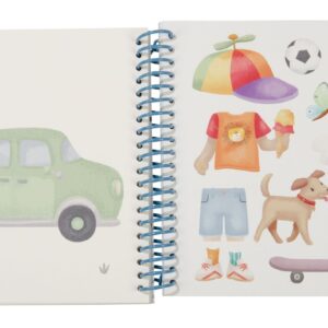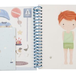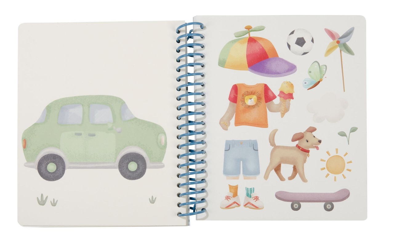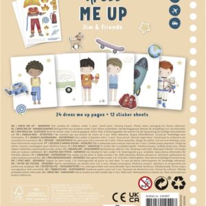 Libro vista a Jim & Friends con anillas. Contiene 24 páginas con modelos y 12 hojas de pegatinas con atuendos y accesorios. Con tapa dura, ideal para jugar en casa y para llevar.