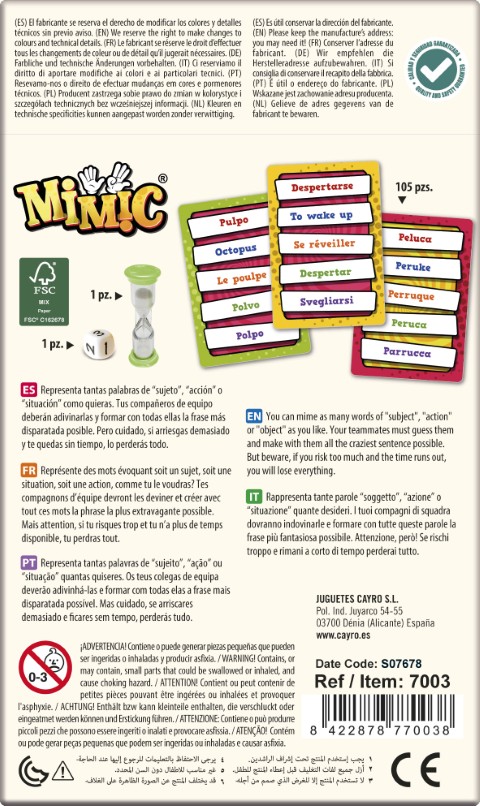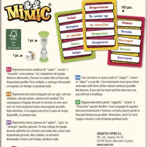 Mi Mic: ¡Riesgo, mímica y frases disparatadas!. Delirante juego de mímica y sonidos en el que, por turnos, un jugador debe interpretar en un minuto el número de palabras que indique el dado y formar una frase.