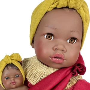 Alika con bebé es una muñeca que mide 40cm. Tiene las extremidades de vinilo y el cuerpo blando elaborado con tejido hipoalergénico. Este modelo nos transporta a un día de safari.