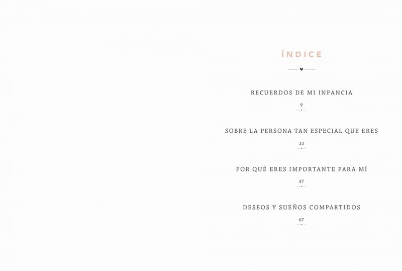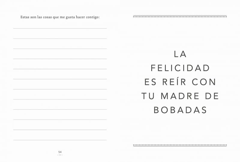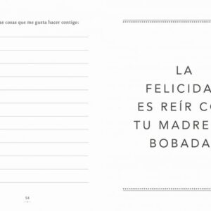 Dile a tu madre lo especial que es creando algo a partir de las experiencias que habéis compartido. La idea es sencilla y divertida y las posibilidades, infinitas, tan infinitas como tu deseo de hacerla feliz. Con este pequeño libro puedes contarle a tu madre todo lo que quieras. Comparte con ella los mejores momentos de tu infancia, escribe sobre lo que significa para ti, explícale tus sueños o cómo os veis en un futuro. Para hacerlo, solo tendrás que responder a divertidas preguntas y decidir con qué fotos, entre otras cosas, quieres viajar en el tiempo.