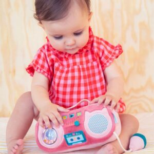 ¡Una divertida radio de tela para despertar al bebé! Al manipularla, emite sonidos alegres que llaman la atención y estimulan el oído. Suave y original por su forma, esta radio invita al bebé a explorar, desarrollar sus sentidos y dejar volar su imaginación. El módulo sonoro tiene un botón de encendido/apagado y se puede quitar para un fácil lavado a máquina.