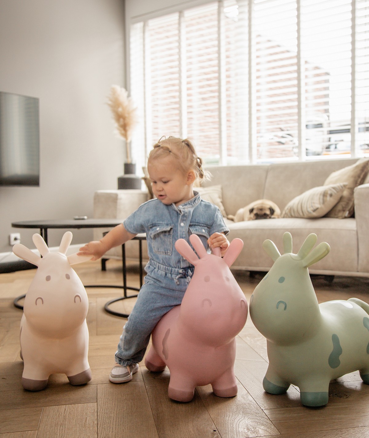 El animalito saltarín está hecho de plástico resistente y se puede sujetar por las orejas. Con la bomba manual incluida, se infla rápida y fácilmente. Apto para niños a partir de 12 meses y soporta un peso máximo de 25 kg.