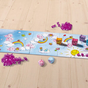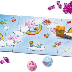 Encantador juego de recorrido en el que los unicornios deben recorrer el país de las nubes en busca de cristales. Con la ayuda de los dados avanzan por el tablero o recogen cristales, y quien alcance primero la meta logra 4 cristales adicionales. Gana quien acumule más cristales. Tablero a doble cara con contador de cristales en el reverso.