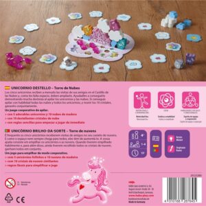 OTROS DETALLES: Con 5 adorables unicornios y 10 nubes de madera, con 10 destellantes cristales de nube, con reglas sencillas para una diversión rápida, un nuevo juego de la exitosa colección de Unicornio Destello