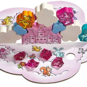 Juego cooperativo en el que por turnos se van apilando nubes y unicornios de madera sobre el castillo, o bien se colocan cristales de nube en los huecos, en función del resultado del dado. Si se logran colocar todas las piezas y cristales antes de que se descubran tres fichas de nubarrón, todos/as ganan conjuntamente.